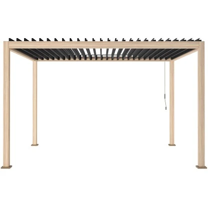 Die Gartenpergola besitzt ein funktionales Lamellendach, das Sie per einfach zu bedienender Handkurbel in die gewünschte Neigung bringen können. Ein integriertes Wasserabflusssystem innerhalb der Steigpfähle sorgt für einen schnellen Ablauf von Regenwasser. Gefertigt ist der Sonnen- und Wetterschutz aus langlebigem und witterungsbeständigem Aluminium, das eine elegante Beschichtung aus Polyester aufweist. Das Gestell ist mit Montagefüßen ausgestattet für eine feste Verbindung mit dem Untergrund.