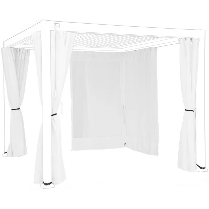 Qualitativ überzeugen Vorhang und Netz durch die Fertigung aus strapazierfähigem Polyester. Dank der pflegeleichten Eigenschaften ermöglichen Sie Ihnen eine einfache Reinigung. Zur Befestigung dienen langlebige und stabile Schienen aus Aluminium. Ausgestattet sind Eckvorhang und Netz zudem mit praktischen Verschlüssen, sodass Sie die Pergola vollständig schließen können. Im Lieferumfang sind vier Vorhänge inklusive.