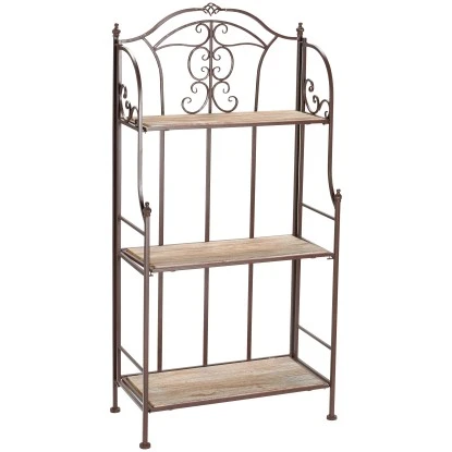 Mit dem handgearbeiteten Blumenregal lassen sich Zierpflanzen oder Küchenkräuter auf verschiedenen Etagen unterbringen. Zu diesem Zweck kann es außen auf dem Balkon, der Terrasse oder in Innenbereichen aufgestellt werden. Das verzierte Gestell ist aus Metall gefertigt. Als Ablagen dienen drei herausnehmbare Einlegeböden aus Holz in unterschiedlichen Tiefen. Wird das Regal gerade nicht gebraucht, lässt es sich platzsparend zusammenklappen. Das Pflanzenregal hat eine Höhe von 122 cm und ist 31 cm breit bei einer maximalen Tiefe von 60 cm.