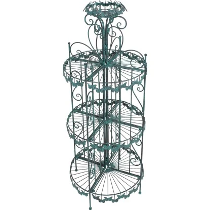 Das dekorative Regal ist aus pulverbeschichtetem Stahl in Antik-Grün gefertigt. An den einzelnen Regalebenen verleihen Zierornamente in Schmetterlingsform diesem Schmuckstück seinen ganz besonderen Charme.