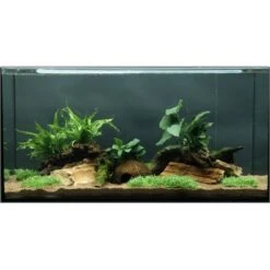 Anubias barteri auf Wurzel (1 Stück), Microsorum pteropus auf Wurzel (2 Stück), Coco Cave mit Anubias barteri nana (1 Stück), Mooswurzel (3 Stück), Lilaeopsis brasiliensis Pad (5 Stück).
