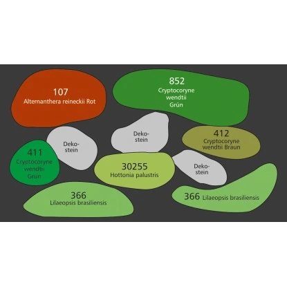 Alternanthera reineckii Rot im Topf (2 Stück), Cryptocoryne wendtii Grün im Topf (1 Stück), Cryptocoryne wendtii Braun im Topf (1 Stück), Lilaeopsis brasiliensis im Topf (5 Stück), Hottonia palustris im Topf (2 Stück), Bacopa caroliniana im Bund (5 Stück).