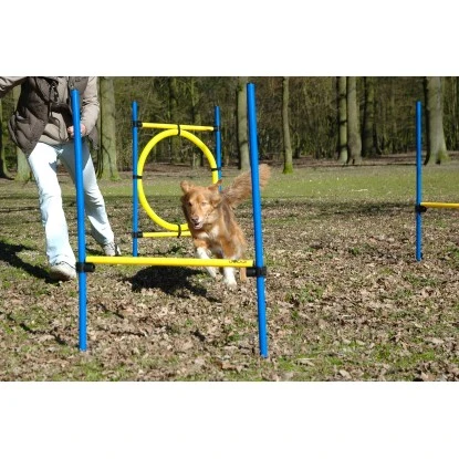 Hürden und der Sprungreif sind Klassiker des Hundesports und sollten in keinem Agility-Kurs fehlen. Dieses 3-teilige Hundesport-Set besteht aus 2 stufenlos höhenverstellbaren Hürden (je ca. 65 cm breit) und einem Sprungring mit einem Durchmesser innen von ca. 60 cm. Alle Stationen bestehen aus robusten Kunststoffstangen mit einer Höhe von ca. 100 cm (Ø ca. 2 cm). Die Stangen verfügen jeweils über einen langen Erdspieß aus Metall, der für eine gute Standfestigkeit auch bei Berührung sorgt. Zudem ist eine praktische Tragetasche im Lieferumfang enthalten. Das mitgelieferte Beiblatt enthält praktische Tipps zum Aufbau und zur korrekten Durchführung der Übungen.