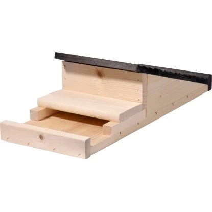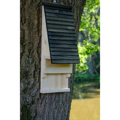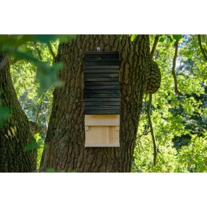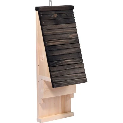 Die Bestände einheimischer Fledermäuse sind in den letzten Jahren vielerorts stark zurückgegangen. Obwohl alle der 22 verschiedenen hier lebenden Fledermausarten unter Naturschutz stehen, konnte diese Entwicklung nicht aufgehalten werden. Dabei sind die faszinierenden Tiere sehr nützlich, da sie jede Menge Schädlinge, nicht zuletzt den Eichenprozessionsspinner, vertilgen, sobald es dunkel wird. Mit diesem großen Fledermauskasten können Sie den Fledermäusen direkt bei Ihnen im Garten Unterschlupf gewähren und einen Beitrag zum Schutz der bedrohten Arten leisten. Tagsüber ruhen die Fledertiere im sicheren Kasten, sodass man sie kaum zu Gesicht bekommt. Die durchdachte Konstruktion verfügt über fünf gefräste Spalten, die eine stetige Belüftung des Innenraumes gewährleisten. Eine Anflugleiste an der Unterseite erleichtert den Fledermäusen zudem die Landung. Mithilfe der robusten Metall-Öse kann das Fledermaushotel überall an Hauswänden und Bäumen aufgehängt werden. Das verwendete Nadelholz ist FSC®-zertifiziert und stammt aus nachhaltiger und umweltfreundlicher Forstwirtschaft aus europäischen Wäldern. Die Herstellung in europäischer Produktion erfolgt in Handarbeit mit Fokus auf bester Qualität in der Verarbeitung. Die Außenmaße des Nistkastens betragen ca. 19,5 x 14 x 53,5 cm (L x B x H).
