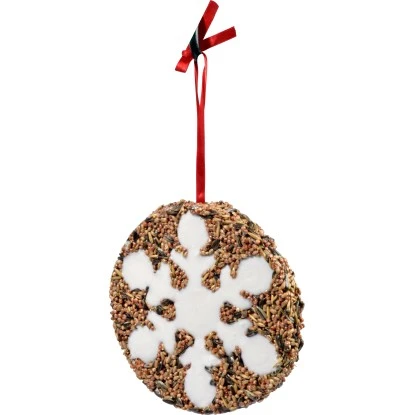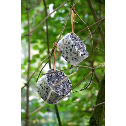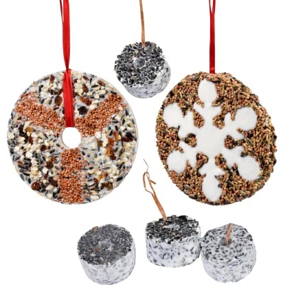 Das energiereiche Fettfutter stellt eine optimale Ergänzung zur natürlichen Ernährung der Wildvögel dar und ist für die ganzjährige Fütterung geeignet. Der Vogelfutter-Mix ist so zusammengestellt, dass die speziellen Bedürfnisse der gefiederten Gäste erfüllt werden. So weisen die Meisenringe und der Vogeltaler einen besonders hohen Fettgehalt auf, während der Vogelkuchen mit seinem hohen Anteil an Kernen und Saaten eine willkommene Quelle für Rohproteine ist. Das Vogelfutter-Set zum Aufhängen enthält vier große Meisenringe, einen „Vogeltaler“, sowie einen Vogelkuchen mit Schneeflocken-Muster. Die Meisenringe (Ø 8 cm) wiegen je ca. 210 g, während der Vogeltaler (Ø 17,5 cm) ca. 470 g wiegt und der Vogelkuchen „Schneeflocke“ (Ø 17,5 cm) etwa 360 g schwer ist.