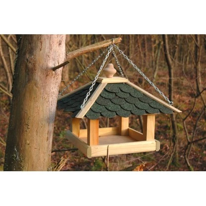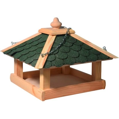 Das Vogelhaus besteht aus wetterfest imprägniertem Kiefernholz (Pinus sylvestris, Hauptholzart) und hat ein wasserdichtes Dach, das mit grünen Bitumenschindeln bedeckt ist. Dabei schützt der große Dachüberstand das Vogelfutter zuverlässig vor Regen und Schnee. Mit der Metallkette kann das Vogelhäuschen überall im Garten und auf dem Balkon aufgehängt werden, z.B. an Bäumen und Hauswänden.