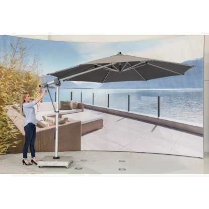 Um den Schirm direkt aufstellen zu können, benötigen Sie zusätzlich einen Schirmständer mit einem Mindestgewicht von 140 kg. Passende Produkte finden Sie natürlich hier im OBI Online Shop.