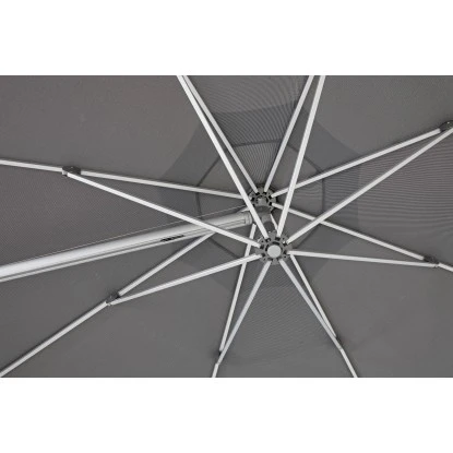 Der Mast und die Streben des Schirms sind aus leichtem, aber stabilem Aluminium gefertigt und exzellent verarbeitet. Dank des Mastdurchmessers von 65 mm hält er auch widrigsten Witterungsbedingungen problemlos stand. Die strapazierfähige Bespannung aus 100 % Polyester-Gewebe (220 g/m²) ist robust, abnehm- und waschbar. Außerdem zeichnet sie sich durch eine vorzügliche Lichtechtheit aus, was bedeutet, dass das Material auch bei starker Sonneneinstrahlung nicht ausbleicht. Mit dem Lichtschutzfaktor des Schirms von UV 80 können Sie den Sommer unbeschwert genießen.