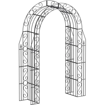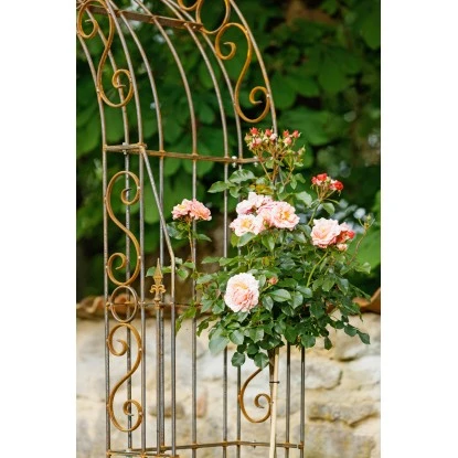 Das Grundelement besteht aus 4 geraden und 2 gebogenen Teilen, die sich schnell und einfach mit Schrauben, Unterlegscheiben und Muttern miteinander verbinden lassen. Das romantisch-verspielte Flair bekommt der Rosenbogen Calabria durch die eingearbeiteten doppelten S-Dekore, Ringe und Kreuzlilien. Mit einer Gesamthöhe von 234 cm und einer Breite von 160 cm bietet er einen 220 x 110 cm großen Durchgang. Alle Elemente des Rosenbogens sind aus hochwertigem Schmiedeeisen handgefertigt. Die Verwendung von Flacheisen und massiven Rundstäben verleiht dem Rosenbogen Stabilität und macht ihn so zu einer langlebigen Zierde. Für einen festen Halt des ca. 59,5 kg schweren Calabria sorgen die Befestigungslaschen an den unteren Seitenelementen. Durch diese stellen Sie eine sichere Verankerung mit Gewindestäben im Boden sicher.