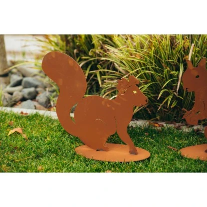 Die Ferrum Art Design Deko-Figur Eichhörnchen Pauline wird aus Stahlblech gefertigt und gerostet. Sie überzeugt als niedliches Accessoire für jeden Garten.