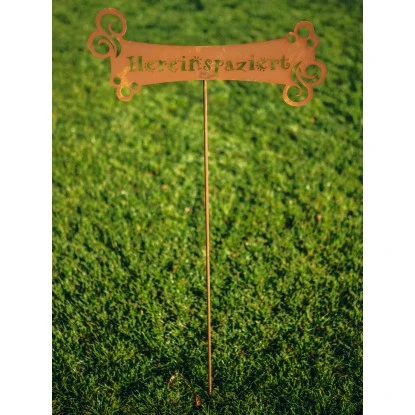 Der Ferrum Art Design Gartenstecker Hereinspaziert ist aus gerostetem Metall gefertigt und bereitet jedem Gast einen herzlichen Empfang.
