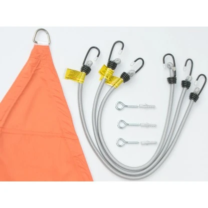 Im Lieferumfang enthalten sind außerdem 3 Ringösenschrauben (ca. 5 mm x 503 mm) und Dübel (8 mm x 40 mm). Mit einem 8 mm Steinbohrer können Sie das Segel auch in Stein befestigen.