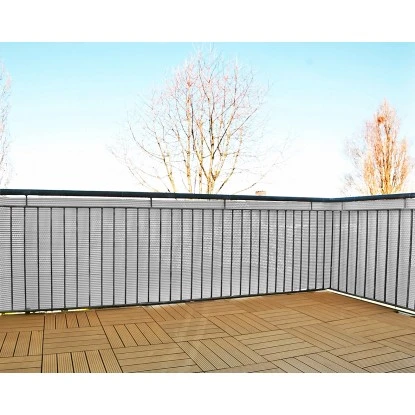 Der Gartenfreude Polyrattan Sichtschutz ist ein dekorativer Sichtschutz für Ihren Balkon oder für den Garten. Der Sichtschutz ist individuell zuschneidbar und aus PE-Kunststoffgeflecht gefertigt, das witterungsbeständig und pflegeleicht ist. Neben einem Einsatz als Balkon Sichtschutz kann z.B. auch ein einfacher Selbstbau von schönen Gartenzäunen, z.B. als Verkleidung von Stab- oder Holzzäunen, erfolgen. Die Anbringung an der Balkonbrüstung wird mit den beigefügten Kabelbindern durchgeführt, bei Stabbrüstungen wird der Sichtschutz einfach durchgefädelt.