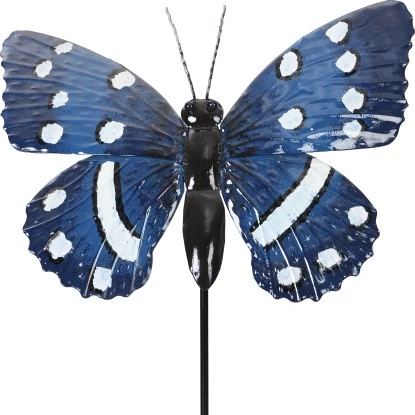 Der Gartenstecker Schmetterling lässt sich zur Verschönerung von Beeten und Pflanzkübeln verwenden. Dabei ist der Schmetterling detailreich gestaltet und in einem modernen Blau gehalten. Neben dem Einsatz auf dem Balkon, der Terrasse und im Garten lässt sich der Metallstecker auch im Innenbereich dekorieren. Qualitativ besticht der durch die Fertigung aus Metall. Seine Größe misst 110 cm x 33,5 cm [95 cm x 24 cm] (H x B).
