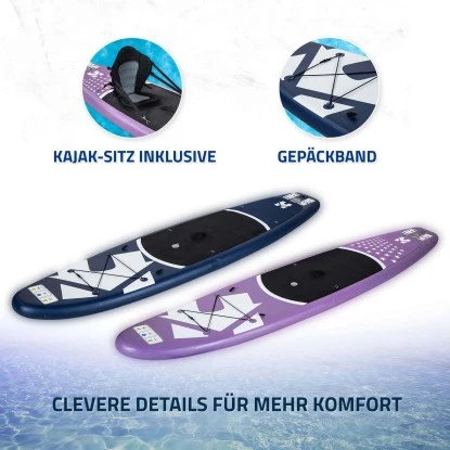 – Kajak-Sitz: Um auf dem SUP zu entspannen, haben Sie die Möglichkeit, einen Kajak-Sitz ganz einfach anzubringen. Für einen optimalen Sitzkomfort ist dieser extra gepolstert. Durch den Sitz können Sie ihr SUP auch zu einer Art Kajak umfunktionieren.