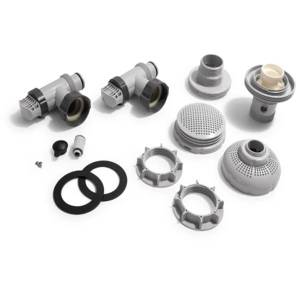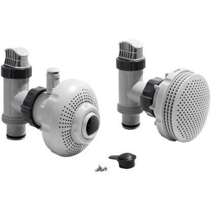 Das Intex Anschluss-Set 7,3 bis 9 m3/h Kunststoff Grau Schwarz Ø38mm ist für alle Intex Pools mit Ø38mm Schlauchanschluss und einer Förderleistung der Filterpumpe von 7,3 bis 9 m3/h geeignet. Es besteht aus 2 Stk. Absperrschieber, 1 Stk. Verschlusskappe, 1 Stk. Wasserbelebungsdüsen-Set und 1 Stk. Siebgitter.
