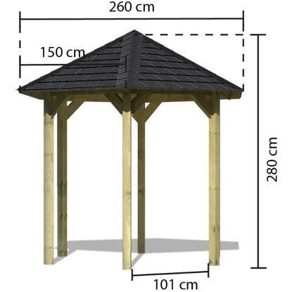 Der sechseckige Pavillon Alicante hat ein Außenmaß von 235 cm x 208 cm und ein Dachstandmaß von 299 cm x 260 cm. Die Seitenhöhe beträgt 199 cm, der First misst 280 cm. Das formschöne Walmdach wird von 6 Pfosten gestützt, die jeweils 9 cm x 9 cm stark sind. Die Pfosten und weiteren Sparren Querverbinder sind kesseldruckimprägniert und somit gegen Witterungseinflüsse bestens geschützt. Wir empfehlen die Verwendung von passenden H-Ankern mit einer Länge von 60 cm für die Befestigung im Untergrund.