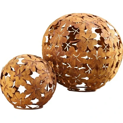 Die Klee Kugel hat eine rostbraune Farbe und besteht aus Eisen. Die vielen kleinen Kleeblätter sind zu einer hübschen Kugel zusammengefügt und sind ein Blickfang in Ihrem Garten. Zwischen den Blumen und Sträuchern können Sie so einen schicken Hingucker positionieren. Die Kugel hat einen Durchmesser von etwa 23 cm.