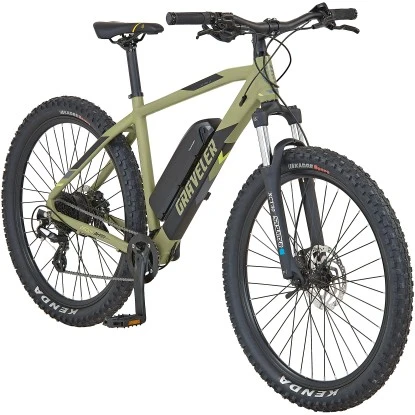 Ein guter Einstieg in die Welt der E-MTBs ist das Prophete Graveler 22.ESM.20 mit seiner leistungsstarken Blaupunkt Technologie. Das Hardtail mit einer Rahmenhöhe von 48 cm ist ein Preis-Leistungs-Monster, denn der 36 Volt Blaupunkt Heckmotor lässt für Anfänger*innen und fortgeschrittene Fahrer*innen mit seinem maximalen Drehmoment von 40 Nm und einer Leistung von 250 Watt nur wenige Wünsche offen. Der 104 Ah DownTube Akku von Blaupunkt liefert Energie für bis zu 100 km, je nach Fahrweise und Untergrund und mit der integrierten Schiebehilfe lässt sich das E-Bike auch an anspruchsvollen Bergen problemlos wieder für die nächste Abfahrt hochschieben.