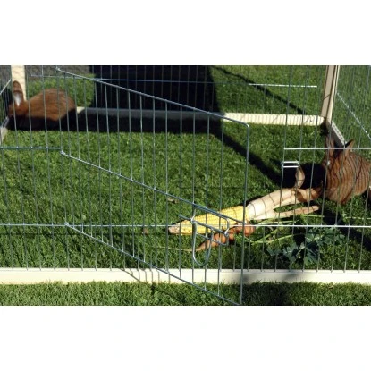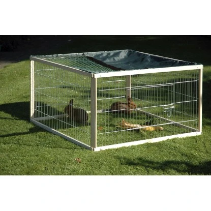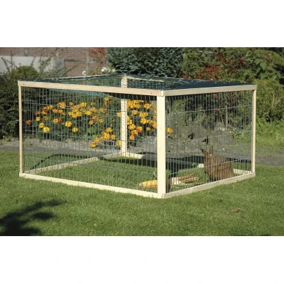 Das quadratische Freilaufgehege ist hauptsächlich aus Nadelholz gefertigt und eignet sich für Kleintiere wie Zwergkaninchen und Meerschweinchen. Ideal für den gesicherten Auslauf im Garten. Inklusive stabiler Metallgitter.