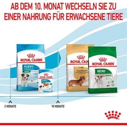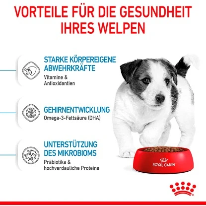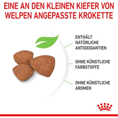 Das Royal Canin Hunde-Trockenfutter Mini Puppy für Welpen kleiner Hunderassen ist speziell auf die Bedürfnisse von Welpen kleiner Hunderassen abgestimmt. Die Nahrung eignet sich speziell für Welpen im Alter von 2 – 10 Monaten, die als ausgewachsener Hund ein Körpergewicht von bis zu 10 kg erreichen. Die Form der Kroketten ist klein und leicht zu kauen, perfekt an den Kiefer kleiner Welpen angepasst. Sowohl der Geruch als auch der Geschmack des Futters sind so optimiert, dass es selbst wählerischen Hunden schmeckt. Das Welpenfutter unterstützt sowohl die Zahngesundheit als auch die allgemeine Mundhygiene des Welpen. Es unterstützt die Entwicklung der körpereigenen Abwehrkräfte von Welpen durch einen Nährstoffkomplex mit Vitamin E und C. Es ist mit einer Omega-3-Fettsäure (DHA) angereichert, die wissenschaftlich nachgewiesen die Gehirnentwicklung von Welpen unterstützt und den Lernprozess beim frühen Welpentraining fördern kann. Zudem unterstützt eine Kombination aus Präbiotika (MOS) und hochverdaulichen Proteinen eine ausgewogene Darmflora und eine gesunde Verdauung.