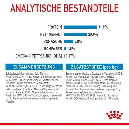 Geflügelprotein (getrocknet), Reis, Tierfett, Weizenkleberfutter*, Mais, Rübentrockenschnitzel, Maisfuttermehl, tierisches Protein hydrolysiert, Maiskleberfutter, Mineralstoffe, Sojaöl, Fischöl, Fructo-Oligosaccharide, Hefe hydrolysiert (Quelle für Mannan-Oligosaccharide und Beta-Glucane) 0,30%, Algenöl Schizochytrium sp. (Quelle für DHA), Saft von Yucca Schidigera, Tagetesmehl.