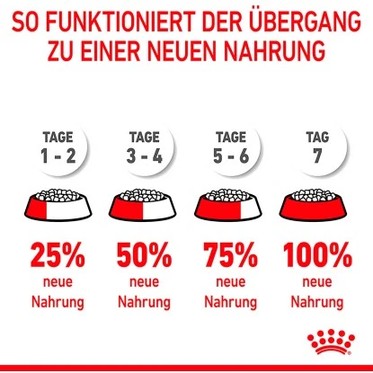 Endgewicht 7 kg: 2. Monat: 92 g, 4. Monat: 120 g, 6. Monat: 120 g, 10. Monat: 80 g, 11. Monat: Mini Adult in Soße