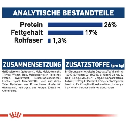 Geflügelprotein (getrocknet), Reis, Tierfett, Weizen, Weizenfuttermehl, Maisfuttermehl, Pflanzenproteinisolat*, tierisches Protein (hydrolysiert), Maiskleberfutter, Mais, Lignozellulose, Rübentrockenschnitzel, Fischöl, Sojaöl, Hefen und deren Teile, Mineralstoffe, Psyllium (Hüllschichten und Samen), Fructo-Oligosaccharide, Borretschöl, Tagetesblütenmehl (Quelle für Lutein), Hydrolysat aus Krustentieren (Quelle für Glukosamin), Hydrolysat aus Knorpel (Quelle für Chondroitin). *L.I.P.: Für ihre sehr hohe Verdaulichkeit ausgewählte Proteine.
