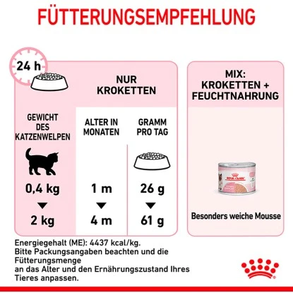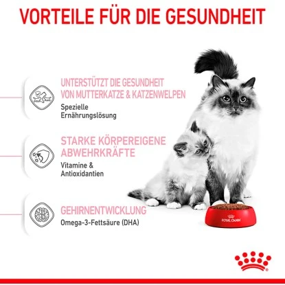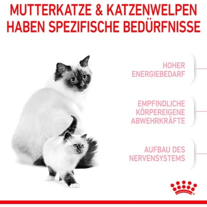 Trächtige Katzen oder solche, die kürzlich einen Wurf hatten, haben spezielle Bedürfnisse in puncto Ernährung. Daher ist es wichtig, dass sie und ihre Kätzchen die richtige Ernährungsunterstützung erhalten, um eine lang anhaltende Gesundheit der Mutter und einen bestmöglichen Start für ihre Kitten zu ermöglichen. Royal Canin Mother and Babycat ist speziell auf die Ernährungsbedürfnisse der Katzenmutter und ihrer Kitten abgestimmt. Es eignet sich für trächtige bzw. säugende Katzen sowie für 1 bis 4 Monate alte Kätzchen im ersten Lebensjahr.