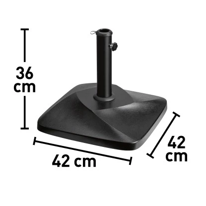 Mit dem quadratischen Schirmständer Dalveen lassen sich unterschiedlich große Sonnenschirme aufstellen. Er ist in massiver Bauweise gefertigt und bietet durch sein hohes Eigengewicht einen guten Halt. Seine Masthalterung ist mit einem Kombi-Adapter ausgestattet, die ein einfaches Fixieren des Schirmstocks erlaubt. So können Schirmmaste mit einer Stärke von 35 mm bis 48 mm befestigt werden. Geeignet ist 42 cm x 42 cm (B x T) große und 36 cm hohe Ständer für Schirme mit einem Ø von bis zu 300 cm. Hergestellt ist der Schirmhalter aus schwerem Beton in der Farbe Schwarz.