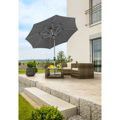 Der Mast und die Streben des Schirms aus leichtem, aber stabilem Aluminium überzeugen mit höchster Verarbeitungsqualität. Die widerstandsfähige Bespannung aus 100 % Recyceltes Polyethylen-Gewebe (180 g/m²) ist robust, abnehmbar und waschbar. Außerdem zeichnet sie sich durch eine gute Lichtechtheit aus, was bedeutet, dass das Material auch bei starker Sonneneinstrahlung nur wenig bis gar nicht ausbleicht. Dank des Lichtschutzfaktors von UV 50+ können Sie die Sonnentage unbeschwert genießen.