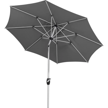 Mithilfe einer Kurbelmechanik lässt sich der Marktschirm bequem öffnen und schließen. Aufgespannt besitzt er einen Ø von 270 cm. Damit Sie den Schirm auch bei niedrigem Sonnenstand morgens und abends perfekt für einen idealen Schattenplatz ausrichten können, lässt er sich am Mast abknicken bzw. neigen. Die Höhe des Sonnenschirms beträgt maximal 250 cm.