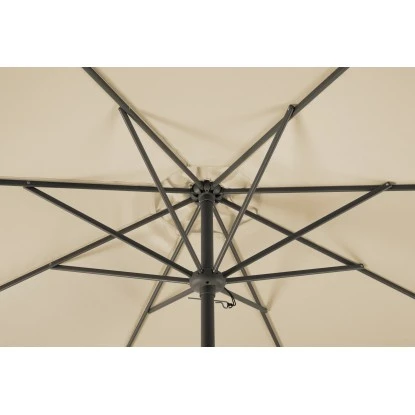 Zudem verfügt der Schirm über eine Kurbel und einen Knicker aus Metall. Die Kurbel ermöglicht ein leichtes Öffnen und Schließen des Schirmes. Mithilfe des Knickers haben Sie die Möglichkeit den Schirm entsprechend der Sonneneinstrahlung auszurichten, um so einen optimalen Sonnenschutz zu erreichen. Die Gesamthöhe des aufgestellten Schirmes beträgt ca. 260 cm, mit einer Durchgangshöhe von ca. 210 cm. Im geknickten Zustand beträgt die Gesamthöhe ca. 270 cm.