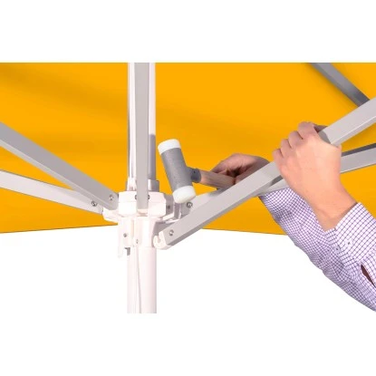 Das Gestell besteht aus einem pulverbeschichtetem Aluminiumstock und eloxierten Streben. Der Stock ist zweiteilig und hat einen starken Durchmesser von ca. 55 mm. Die Streben sind bei Bedarf einzeln auswechselbar. Außerdem verfügt der Schirm Quadro über einen Seilzug mit Selbstarretierung, so wird kein zusätzlicher Sicherungssplint benötigt. Die Gesamthöhe des Schirmes beträgt ca. 295 cm und hat eine angenehme Durchgangshöhe von ca. 223 cm.