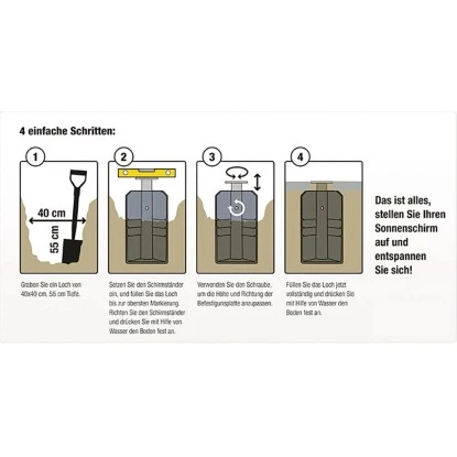 Es wird kein Beton benötigt und der Bodenständer ist einfach einzusetzen. Der Bodenständer ist aus Kunststoff und Stahl in der Farbe anthrazit. Der Ständer ist geeignet für Ampelschirme bis 300×300 cm oder Ø 350 cm mit einem Lochabstand der Bodenplatte 76, 95 oder 113 mm. Passend für alle Siena Garden N+ Ampelschirm-Modelle „Alphawing N+“, „Ikarus N+“, „Sunset N+“, „California N+“.