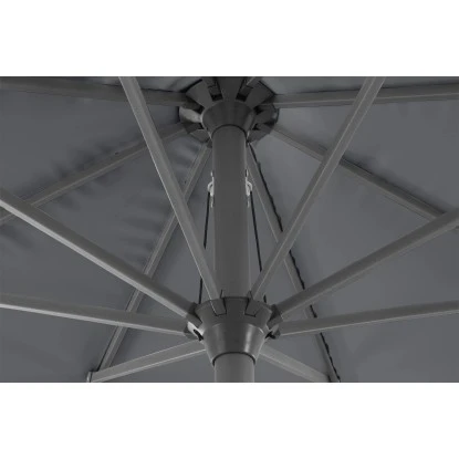 Der Mast und die Streben des Schirms aus leichtem, aber stabilem Aluminium überzeugen mit höchster Verarbeitungsqualität. Dank des Mastdurchmessers von 48 mm hält er auch widrigsten Witterungsbedingungen problemlos stand. Die widerstandsfähige Bespannung aus 100 % Polyester-Gewebe (220 g/m²) ist robust, abnehmbar und waschbar und zeichnet sich zudem durch eine gute Lichtechtheit aus, wodurch das Material auch bei starker Sonneneinstrahlung nur wenig bis gar nicht ausbleicht. Dank des Lichtschutzfaktors von UV 50+ können Sie die Sonnentage unbeschwert genießen.