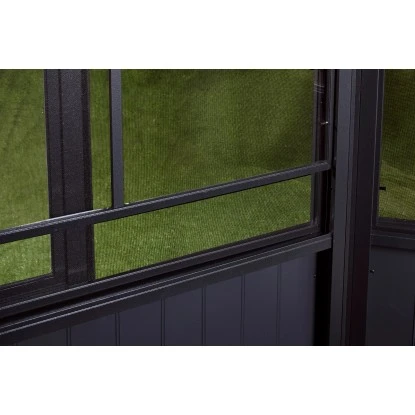 Kontrollierbare Durchlüftung durch 12 Fenster (eins in jedem Wandelement – 94×74 cm BxH) bestehend aus je einem Moskitonetz sowie einem reißfesten PVC-Folien-Fenster, welches zur Durchlüftung einfach nach unten geschoben und mit zwei Handgriffen zum Reinigen herausgenommen wird. Der Aufbau erfolgt durch mindestens 2 Personen mit Hilfe von handelsüblichen Werkzeugen sowie einer detaillierten Schritt-für-Schritt Anleitung. Die Schiebetüren können flexibel auf allen Seiten montiert werden. Zu beachten ist, dass je Seite nur eine Tür eingesetzt werden kann.