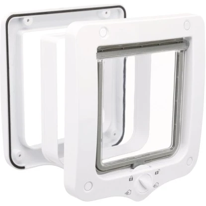 Die 4-Wege Freilauftür mit integriertem Tunnel von Trixie besticht durch Ihre verschiedenen Funktionen. Sie können die Tür komplett öffnen oder schließen. Außerdem haben Sie die Möglichkeit zwischen dem nur raus und nur rein Modus zu wählen. Die Tür besteht aus Kunststoff und verfügt über eine geräuscharme, transparente Klappe sowie zwei Tunnelelementen für Wände und tiefe Türen. Der Drehverschluss mit umlaufender TPR-Dichtung und Magnetverschluss, runden den Komfort ab.