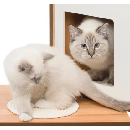 Die Liegefläche über den Höhlen ist mit einem sanften Kissen ausgelegt und bietet Ihrer Katze einen komfortablen Platz zum Ruhen und Beobachten. Sie wird von zwei Kratzstämmen getragen und ist darüber hinaus mit einem Kugel-Spielzeug am Band ausgestattet, das aus dem natürlichen, ungefährlichen Material Rattan besteht und zum Spielen animiert.