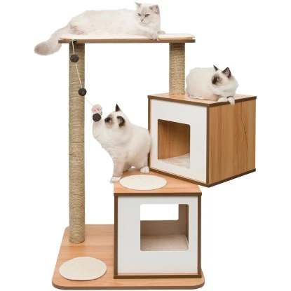 Der Vesper Kratzbaum Double in der Farbe Walnuss hat die Maße 65 cm x 65 cm x 103,5 cm und besteht insgesamt aus drei Ebenen, die Ihrer Katze eine stilvolle Spielwelt mit ausreichend viel Platz bietet. Dabei beinhalten die ersten beiden Ebenen jeweils eine quadratische Kubus-Höhle, während die letzte Ebene aus einer länglichen Liegeplattform besteht. Der Kratzbaum präsentiert ein edles Design und ist aus hochwertigem MDF mit einer kratzfesten Oberfläche gefertigt.