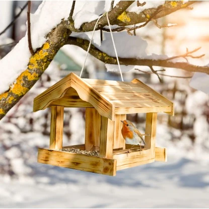 Eine Oase für Vögel Das Vogelfutterhaus aus Massivholz fügt sich harmonisch in den Garten ein und bietet Wildvögeln einen willkommenen Futterplatz. Nicht nur die kalten Winter machen es den Vögeln schwer, Nahrung zu finden. Auch Faktoren wie die zunehmende Bebauung und die intensivere landwirtschaftliche Nutzung von Naturflächen reduzieren die verfügbaren natürlichen Nahrungsquellen. Das Vogelfutterhaus schafft Abhilfe – insbesondere wenn es ganzjährig befüllt wird. Durch das überstehende Dach und das integrierte Futtersilo wird das Futter vor Regen und Schnee geschützt. Wenn eine Reinigung nötig ist, lässt sich diese durch die ausziehbare Futterlade besonders leicht vornehmen. Die praktische Aufhängeschnur ermöglicht eine schnelle und einfache Platzierung des Hauses – im Garten, aber natürlich auch auf der Terrasse oder auf dem Balkon.