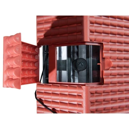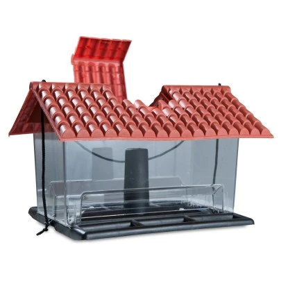 Unterstützung der Wintervögel in der futterarmen Jahreszeit.Das Vogelfuttersilo ,ist aus Kunststoff hergestellt: transparente Sichtwände und rotes Dach. Das Silo hat ,zwei Futteröffnungen und wird über das ,abnehmbare Dach mit ,z.B. Wintermischung oder Sonnenblumenkernen befüllt. Es kann aufgehängt oder auf einem Ständer befestigt werden.