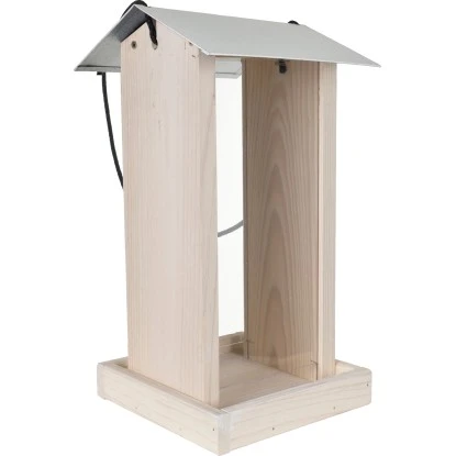 Das Vogelhaus dient der Winterfütterung von kleinen bis mittelgroßen Wildvögel im Garten, auf dem Balkon oder der Terrasse. Seine rechteckige Form ermöglicht ein kontinuierliches Nachrutschen von Kernen und Samen. Durch die Acrylglaseinsätze an den Seiten wird die Futterzufuhr reguliert. Das viereckiges Futtertablett verfügt über eine praktische Rundum-Schutzleiste, damit das Vogelfutter nicht herausfällt. Zum Befüllen der Futterstation kann das Dach einfach abgenommen werden. Das gleichmäßig abschüssige Dach aus Metall ermöglicht das Abfließen von Regen oder Schnee. Gefertigt ist das Vogelhaus aus robustem, lasiertem Kiefernholz. Die Montage erfolgt mittels der hierfür vorgesehen Schnur hängend an einem Baumast oder einer anderen geeigneten Stelle.