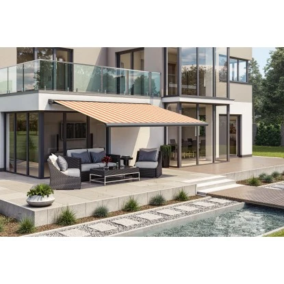 Die Wismar Kassettenmarkise S-Compact ist eine Markise auf dem neuesten Stand in Sachen Technik und Dessin mit der Qualität Made in Germany. Durch das geschlossene Gehäuse ist das Markisentuch perfekt vor Witterungseinflüssen geschützt. Eine lange Lebensdauer sowie ein dekoratives Erscheinungsbild zeichnen dieses Modell aus. Farbenfrohe Dessins in Verbindung mit einer Kassettenmarkise S-Compact schaffen Behaglichkeit und Ambiente auf Ihrer Terrasse oder Ihrem Balkon. Durch den standardmäßigen eingebauten E-Motor mit elektronischer Endabschaltung, bedienen Sie Ihre Markise mit höchstem Komfort. Mit ihren Gelenkarmen aus Aluminium, innenliegender Stahlfedern sowie gesenkgeschmiedeten Aluminium-Gelenkteilen bietet diese Markise einen äußerst hochwertigen Sonnenschutz. Die Markise kann in ihrem Neigungswinkel von 5 bis 50 Grad stufenlos eingestellt werden. Das Markisentuch besteht aus 100 % Polyacryl und ist zudem wasser- und schmutzabweisend imprägniert.