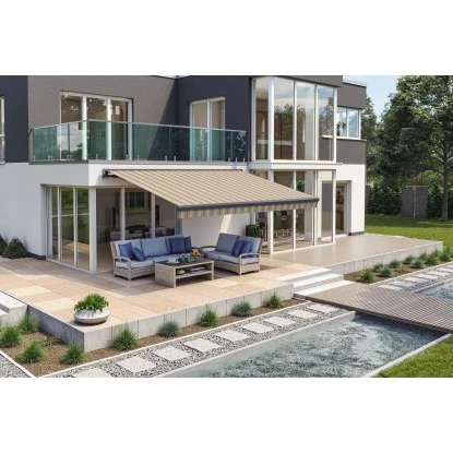 Die Wismar Teilhülsenmarkise überzeugt durch ihr elegantes und zeitloses Design. Durch das integrierte Schutzdachprofil, ist das Markisentuch perfekt vor Witterungseinflüssen geschützt. Somit können grobe Verschmutzungen beim Aufrollen des Tuches herausfallen. Eine Luftzirkulation ist somit optimal gegeben.